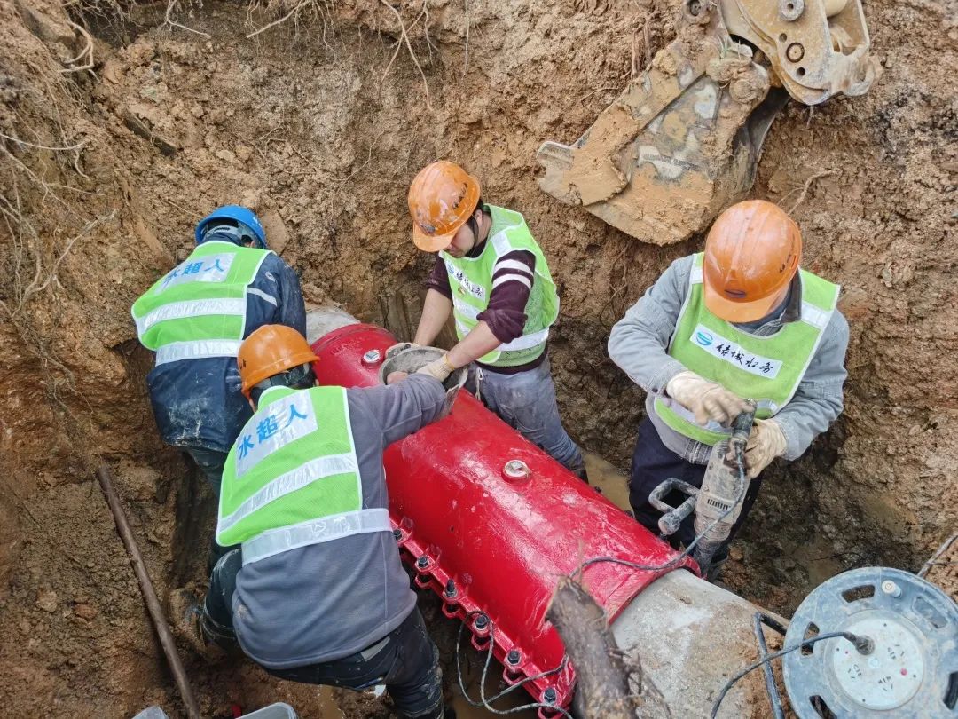 經(jīng)現(xiàn)場勘查,確定是地下一根DN400水泥管突發(fā)爆裂滲水,“水超人”應(yīng)急搶修隊員立即投入“戰(zhàn)斗”。“春節(jié)期間保供水刻不容緩,我們務(wù)必爭分奪秒,盡快恢復(fù)通水,將停水對市民的影響降到最低”,搶修班班長徐振峰一邊指揮搶修隊伍進行搶修,一邊緊急安排送水車確保市民應(yīng)急用水。搶修隊員依據(jù)以往豐富的經(jīng)驗,在錯綜復(fù)雜的地下管線中快速找到漏水點后立即開展管道修復(fù)工作。當(dāng)天陰雨綿綿,現(xiàn)場氣溫降到10℃以下,在水中堅持作業(yè)的搶修隊員們?nèi)頋裢福瑸榱藫寱r間趕進度,隊員們冒著瑟瑟寒風(fēng),在冰冷的環(huán)境下輪流上陣,從趕赴現(xiàn)場處置到恢復(fù)供水只用了5小時,高質(zhì)高效完成了沙井大道DN400水泥管的搶修任務(wù)。今年春節(jié)期間南寧遭遇的低溫寒潮天氣給管網(wǎng)管理處帶來了不小挑戰(zhàn),據(jù)統(tǒng)計,春節(jié)期間公司共出動搶修人員1934人次、搶修車輛312車次,送水車31車次,全力為城市供水命脈暢通保駕護航。