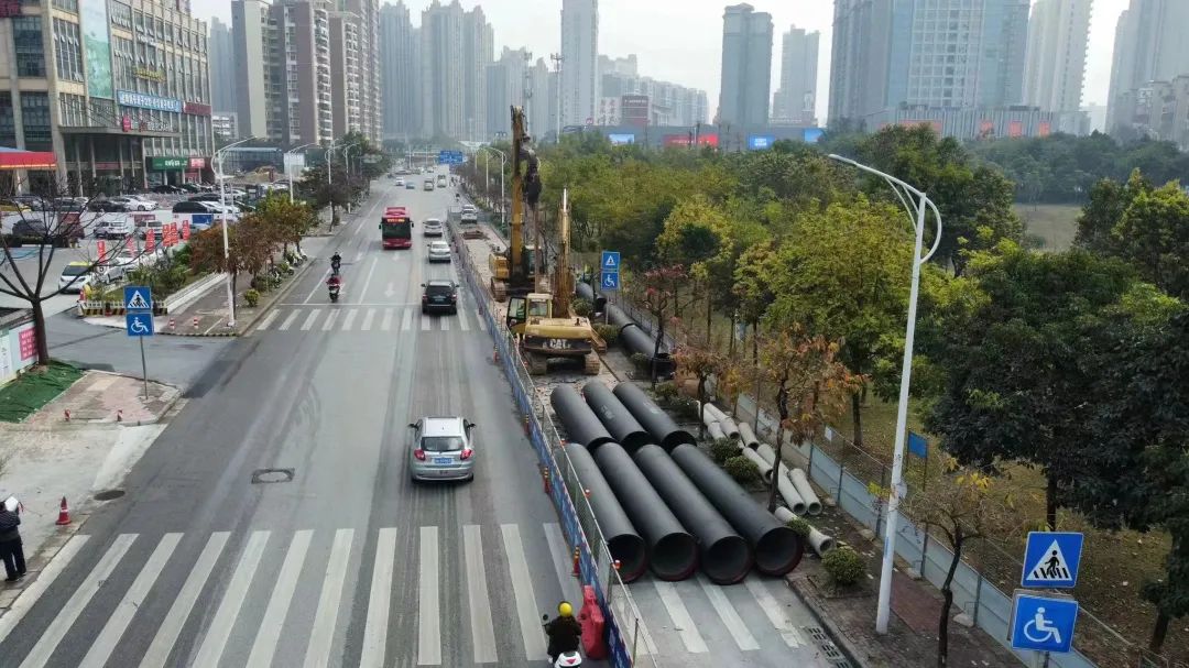 圖為水建公司負責建設(shè)的云景路(埌東加壓站—高坡嶺路)DN1000球墨鑄鐵給水管道工程施工現(xiàn)場