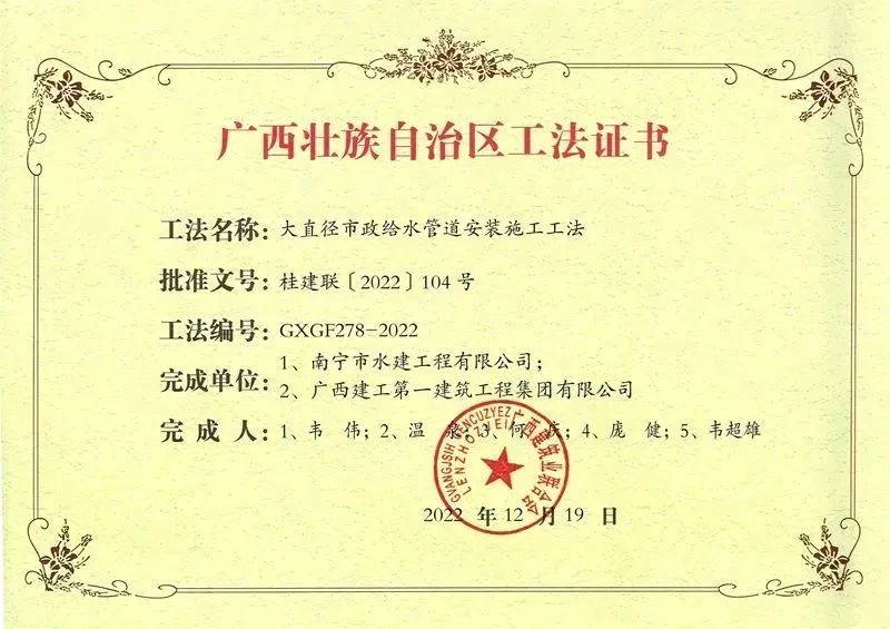 在2022年度廣西壯族自治區(qū)級工程建設(shè)工法評審活動中,由廣西綠城水務(wù)股份有限公司下屬南寧市水建工程有限公司(下簡稱“水建公司”)組織申報的《大直徑市政給水管道安裝施工工法》,經(jīng)自治區(qū)級工程建設(shè)工法評審委員會評審,成功獲評為2022年廣西壯族自治區(qū)級工程建設(shè)工法。