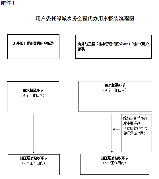 ①委托綠城水務(wù)全程代辦的,無(wú)外線工程施工通水驗(yàn)收時(shí)間不超過(guò)2個(gè)工作日,有外線工程(外線工程長(zhǎng)度≤50m)施工通水驗(yàn)收時(shí)間不超過(guò)5個(gè)工作日,不包含辦理行政審批手續(xù)時(shí)間。