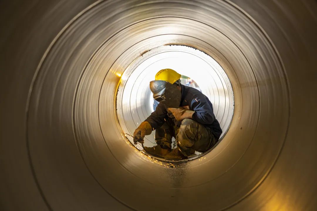 ▲綠城水務(wù)加快推進(jìn)五象供水加壓站擴(kuò)建DN1000出水管建設(shè),圖為施工工人正在焊接管道。水建公司 金志華供圖
